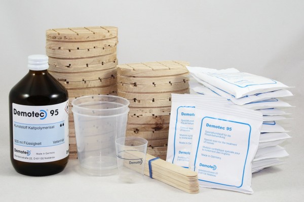 Demotec 95 ist ein Spezialkunststoff, der als Hilfsmittel zur Behandlung von Lahmheiten bei Rindern entwickelt wurde. Durch seine herausragende Quaität und einfache, angenehme Verarbeitung bietet er bei der Behandlung von Klauenerkrankungen eine ideale Problemlösung. Das neuentwickelte DEmotec 95 zeichnet sich besonders durch seine klebefreie Modellierbarkeit aus und kann sofort nach dem Anmischen verarbeitet werden. Unter die gesunde Klaue wird mit dem Kunststoff ein Holzklotz geklebt. Durch diese Erhöhung der gesunden Klaue wird die kranke Klaue entlastet und ruhiggestellt. Diese Druckenlatstung mindert deutlich den Schmerz und führt dadurch spontan zu einer Besserung des Lahmheitsgrades.